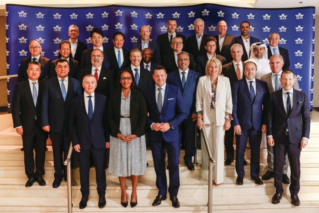 A group picture of the board of governors of IATA (2024-25) from Dubai 2024. Upfront (left to right): IATA DG Willie Walsh, Yvonne Manzi Makolo (CEO, RwandAir) and the incoming Chair of the IATA Board of Governors, Indigo CEO, Pieter Elbers. Photo Credit: Natalia Mroz/IATA