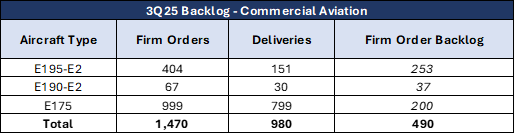 - Commercial Aviation backlog reached US$15.2 billion, a nine-year high driven by strong E195-E2 orders from Avelo Airlines and LATAM Group, supported by a 2.7× book-to-bill ratio.