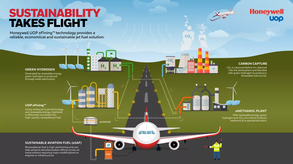 Honeywell’s eFining technology uses carbon dioxide from biological sources, renewable power and hydrogen to produce a variety of electrofuels (eFuels), including eSAF. When blended with conventional jet fuel, eSAF is a drop-in replacement that does not require changes to existing aircraft technology or fuel infrastructure. eSAF can reduce greenhouse gas (GHG) emissions by 88% compared to conventional jet fuel.