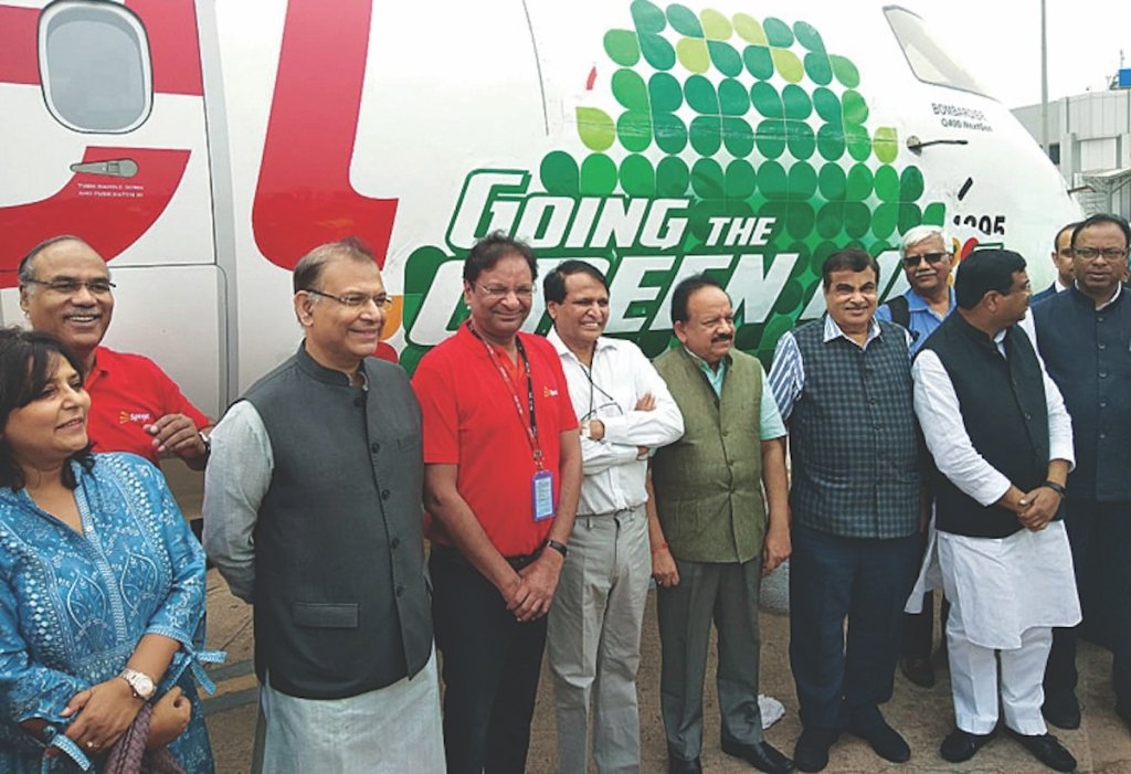 A SpiceJet SAF flight on Q400 aircraft was received at Delhi airport by Union Ministers Nitin Gadkari and his then Ministerial colleagues Dr Harsh Vardhan Suresh Prabhu and the then Minister of State for Civil Aviation Jayant Sinha