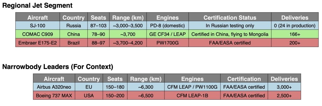 Rather than threatening Boeing or Airbus, the SJ-100 is more about replacing Western aircraft inside Russia. Its role is inward-looking, not globally competitive.