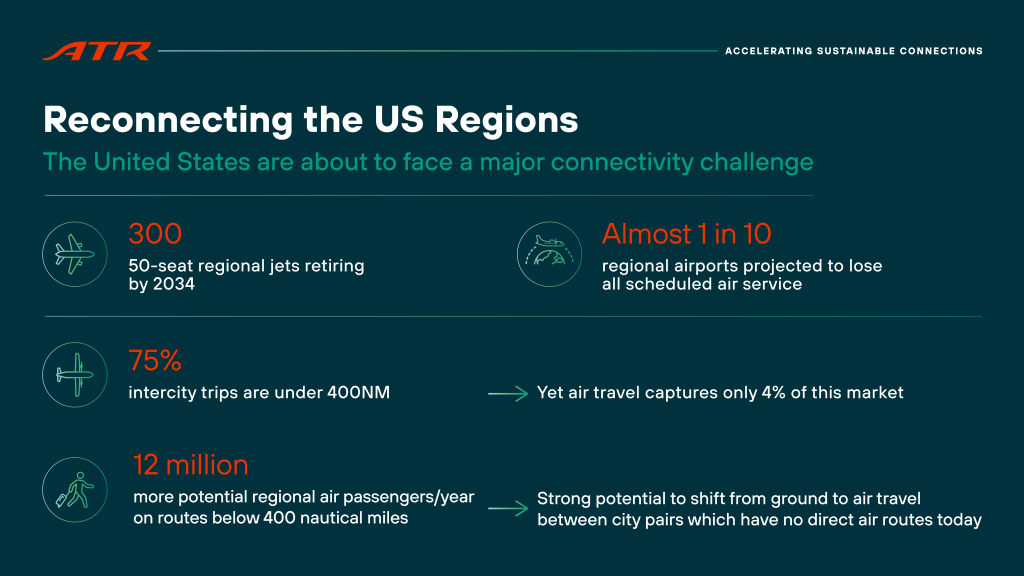 “Routes closed, but demand didn’t go away. We found a market potential of up to 130 routes, now what’s missing is the right aircraft,” said Rich Scheff, Managing Director at Seabury ASG. “Our analysis confirms that a modern, efficient 50-seater like ATR’s can unlock significant value for U.S. airlines and communities alike.”